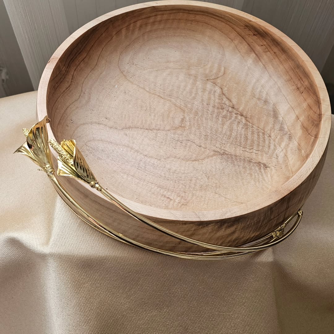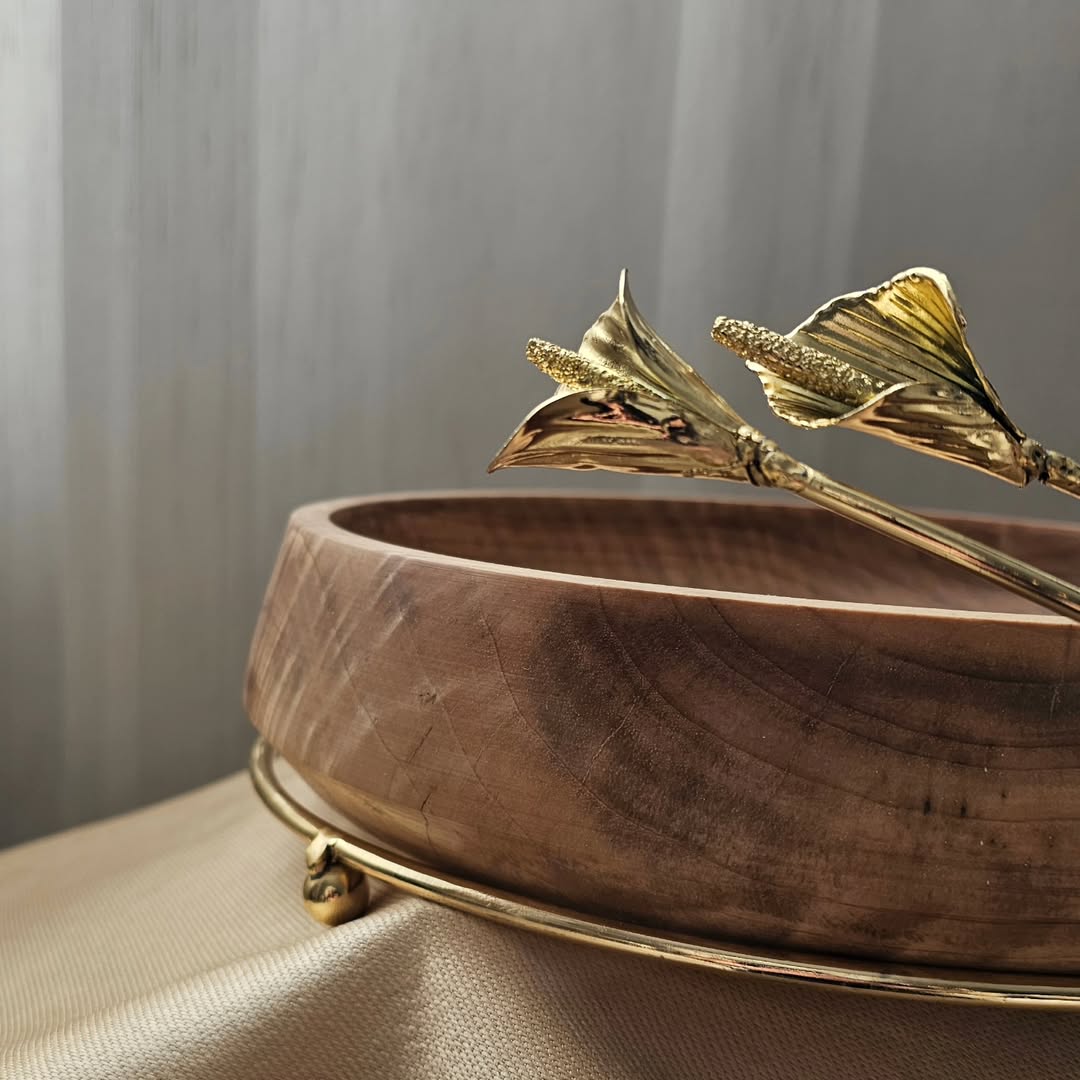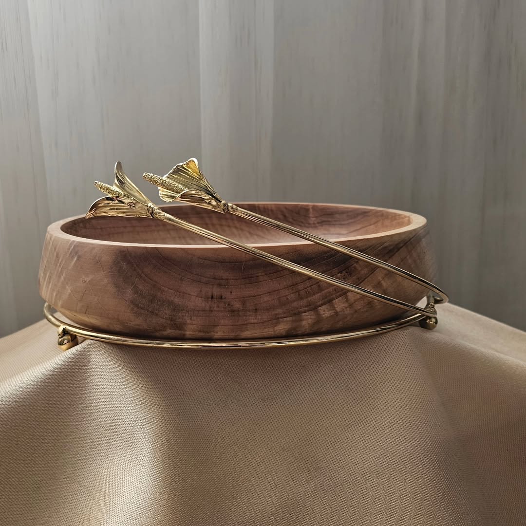 میوه خوری چوب و پایه فلزی با طراحی گل لیلیوم و ابعاد ۳۰ سانتی متر.