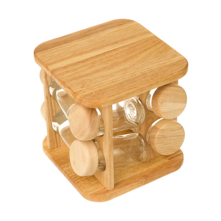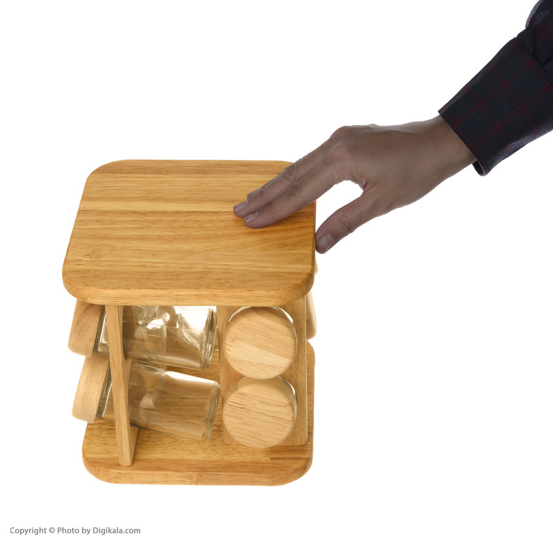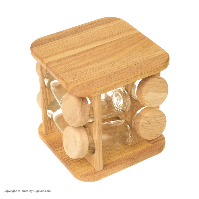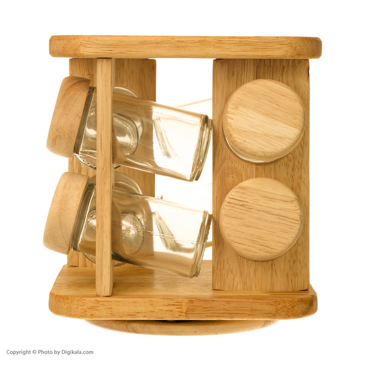 ساخته شده از چوب رابر دارای نقش و خلل و فرج طبیعی شامل 8 جا ادویه شیشه ای با درب چوبی هر یک به قطر 4 و ارتفاع 10 سانتیمر با خروجی ثابت قابلیت چرخش 360 درجه استند نگهدارنده به هر دو طرف شیک و ساده دارای جعبه ساخت کشور ایران